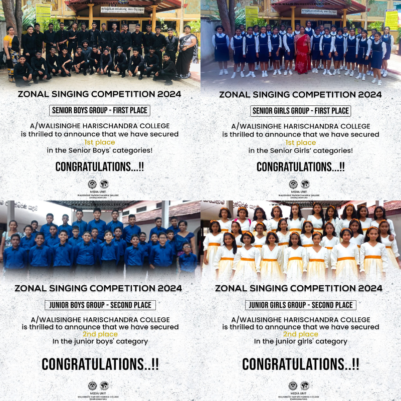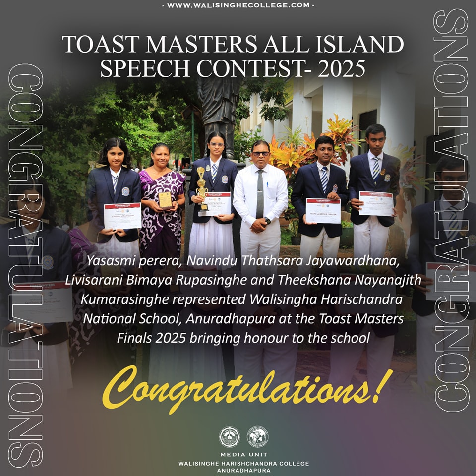 - The Toastmasters Finals 2025 were recently held where our talented contestants —Yasasmi, Livisarani, Nawidu, and Theekshana— proudly represented Walisinghe Harischandra College carrying its legacy to its new heights while securing a well-deserved title.We wish them continued success and many more accomplishments in the future..