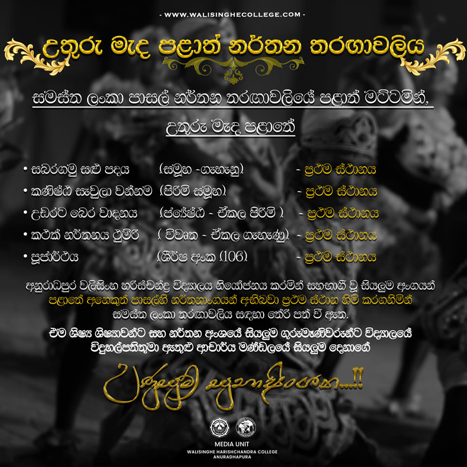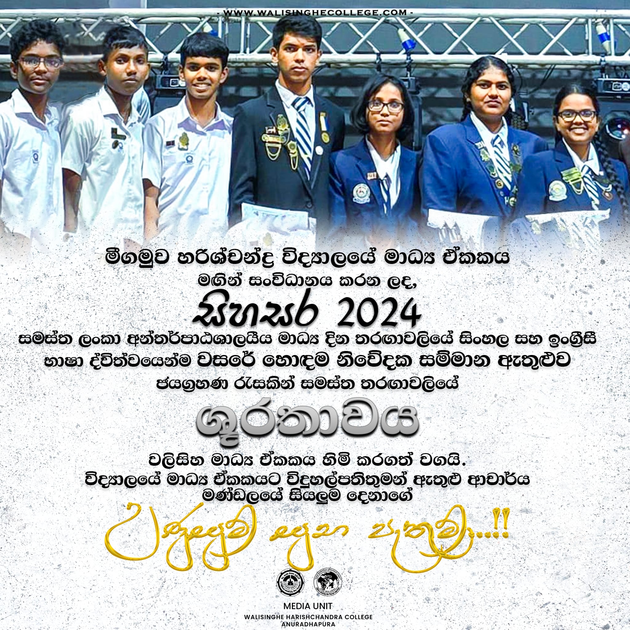 *සිහසර'24* සමස්ත ලංකා අන්තර්පාඨශාලයීය මාධ්ය තරඟාවලියේ, *සමස්ත ශූරතාවය* අනුරාධපුර වලිසිංහ හරිශ්චන්ද්ර විද්යාලයීය මාධ්ය ඒකකය හිමි කරගත් වගයි... ඒ අනුව,